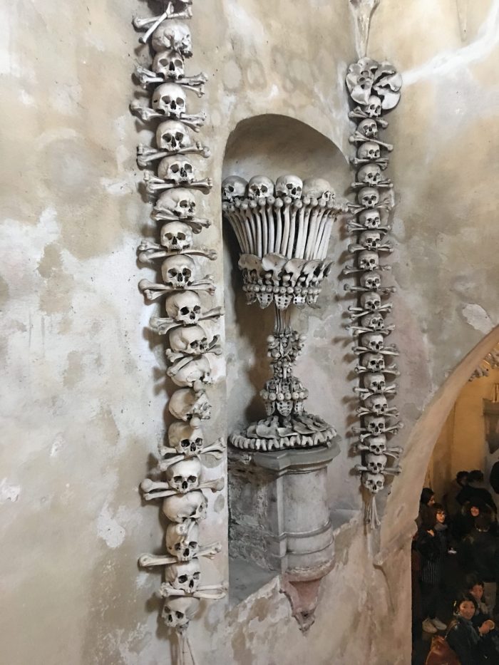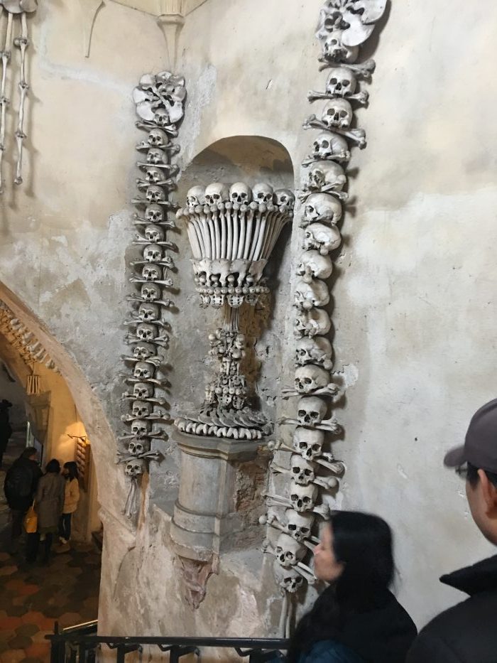 買完票之後去人骨教堂,教堂真的不大,簡單地每個人骨藝術品都瀏覽過後,就出去繞著教堂散步一圈,他們的墳墓樣式種類非常多,印象中沒看到重複的。