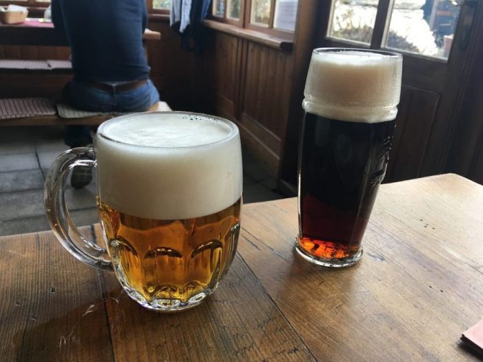 我們點了一個 Czech Dumplings + 牛肉,以及豬肩,覺得比前一天吃到的還好吃!真不愧是第二名。飲料的話則是點了個 light beer 和 dark beer,我個人覺得 dark beer 比較好喝。這樣一餐大約三百多 kc,比第一天少上不少,果然鄉下還是相對物美價廉呢。